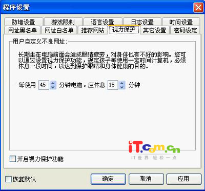 5、 视力保护 长时间的上网会使眼睛疲劳,造成对身体不好的影响,网络爸爸可以设置每次使用电脑的时间及休息时间(如图8),这样就不会担心孩子长时间的使用电脑而影响其视力了。