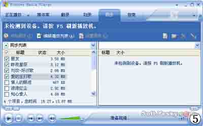 Windows Media Player 10增强了对便携式设备的支持,目前,Windows Media Player 10支持的便携式媒体播放机已超过75种(无需安装驱动程序,你只需将这些设备中的一种设备插入到运行 Windows XP 及 Windows Media Player 10 的计算机上,就准备就绪了。另外值得注意的是,在这已支持的75种设备中,Apple公司的iPod不包括在内)。不仅如此,新增的自动同步功能可以使用户自动的将媒体文件发送到便携式音乐或视频播放机。(如图5所示)