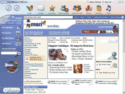 MSN Explorer的左侧主要是一些个性化设置的功能,例如:日程安排表、股市行情、个人站点、个人图片、集成的媒体播放器等。