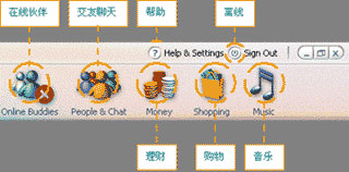 顶部是一字排列着集成了常用WEB功能图标的导航条,如图2和图3所示,利用这些快捷图标你可以实现常规的WEB操作功能,例如:收发邮件、聊天、欣赏音乐、购物等等。