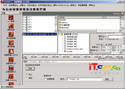 现在我们MP3音乐文件前面的所有路径全部都删除掉,这样就表示播放的文件都是位于根目录下。 光盘刻录 现在我们就可以进行光盘的刻录了,启动CDRWin,在左侧选择“刻录数据CD/DVD”,然后将编写好的Autorun.inf文件添加到中间目标光盘的根目录下,将系统中安装Winamp的目录也放置在光盘根目录下,最后将播放清单中的文件放在光盘根目录下,并单击“动作”区域的“开始”按钮即可。(如图19)