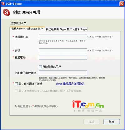 经过几步简单的“点击”就完成了Tom-Skype的安装。在第一次运行的时候,会要求注册一个ID才能使用,点击“我想创建一个新的SKYPE账号”(如图2),