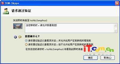 找到好友后,可以直接双击来查看好友的个人资料,也可以点击右键来添加好友到好友列表、发送消息给好友及呼叫好友进行语音聊天,我们选择添加好友,这样以后可以方便在好友列表里找到好友的ID,接着是请求好友验证(如图5),这样我们就完成了添加好友。