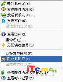3、阻止好友消息 如果不想收到某个好友的消息,也可以通过阻止好友的办法来把这个好友拉到“黑名单”里,这样好友就看不到我们在线,同时好友的消息也不会收到了。 右键点击要阻止用户的ID,选择“阻止此用户”(如图6),