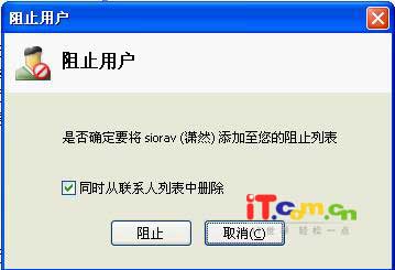 就会弹出阻止用户对话框,如果想要阻止用户的同时删除该用户,那么选中“同时从联系人列表中删除”就可以了(如图7),