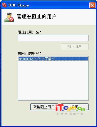 点击阻止按钮,那么该用户就会被阻止同时删除了。如果没有删除用户,又想取消对用户的阻止,只要点击“工具—管理被阻止的用户”,在“管理被阻止的用户”对话框中(如图8),
