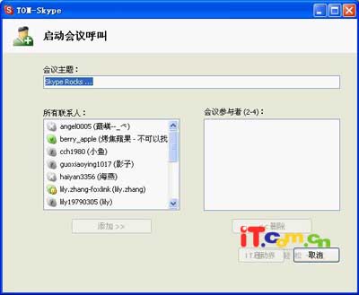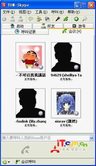 TOM—Skype还有一个更突出的特点,那就是可以与最多与五个人一起进行语音会议。要进行语音会议,可以通过两个办法实现,一是可以通过按住CTRL键,选择多个好友的ID,然后点击右键,选择“创建会议”,这样就会出现呼叫对话框(如图13),