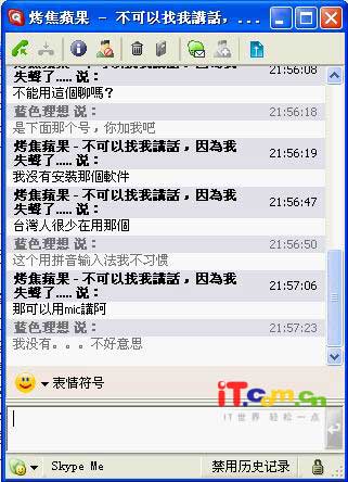 四、不足之处: TOM-Skype是一款不错的互联网语音沟通工具,但由于是刚刚发布,也有一些不足之处,比如好友资料不可以保存到服务器上,只是留在本地机器上,这就意味着我们到其它机器上将看不到以前添加的好友,这对软件的使用受到了很大的限制。同时文字聊天窗口做的还不是很强大,表情图片与QQ、MSN相比起来也有点少。还有一个大的不足之处就是笔者发现TOM-Skype不支持五笔输入法输入文字,笔者用智能五笔在聊天窗口输入文字的时候,只是出现一些空格,而看不到文字,笔者只有用拼音输入法与好友艰难的聊着。