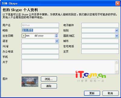 4、个人资料的更改 如果想更改个人资料,只要点击“文件—您的个人资料”,在弹出的个人资料更改窗口(如图9)中可以任意的更改自己的个人资料信息,我们还可以自定义头像,只要点击浏览按钮,选择本地硬盘上的JPG或BMP图像,都可以作为自定义头像,不过这个图片不论多大,都会被Tom-Skype缩小为96*96像素的图片。我们的个人资料都存放在公共目录中,除了EMAIL外,其它信息都会被其它SKYPE用户看到,但是个人资料除了用户名外,其它的信息目前不会被保存到Tom-Skype的服务器上,这些信息只留在本地,如果你72小时未登录的话,你的个人信息就会被自动从公共目录中删除。