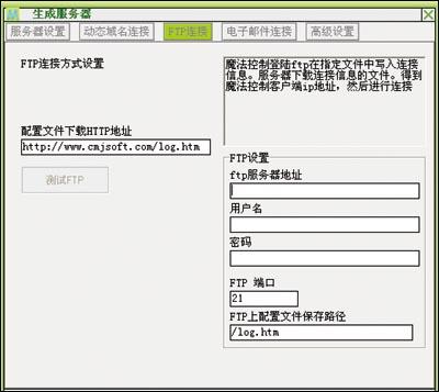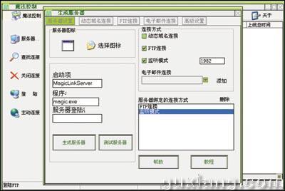 (“魔法控制”是共享软件,软件大小为2.5MB,下载网址:新浪下载中心。) 1. 制作服务器 软件运行后,点击左侧的[服务器]按钮,进入如图1所示界面。对于启动选项名(写入系统注册表启动项里的名字)和启动程序名(服务器运行时候的名字)两项,使用默认值即可;设置服务器登录密码;接下来需要选择服务器的连接方式,共有四种,使用其中一种即可。也可以同时使用多种,即连接方式可以混合捆绑。 (1)FTP连接方式