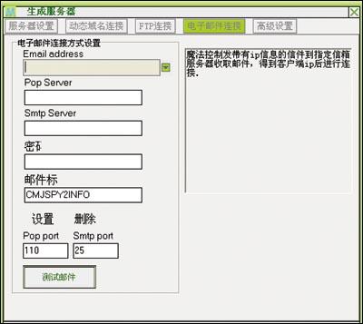 如果使用电子邮件连接方式,请选择电子邮件连接面板(图3),填写正确的电子邮件连接设置(到网上申请一个稳定免费的邮箱即可)。按[测试邮件]按钮,如果显示测试成功,表示该E-mail可用。然后在“服务器设置”面板里添加电子邮件连接方式即可。 “动态域名连接”方式和“主动连接方式”(即“监听模式”,服务器运行后,按[主动连接],输入对方IP地址就可以登录了)的设置与上述两种方式类似。