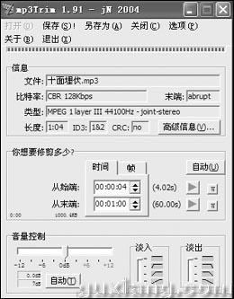 一、修修剪剪随我意 用MP3Trim打开需要编辑的MP3文件,首先映入眼帘的是MP3相关信息,由于我们需要去除文件的爆音,在这里将带有爆音的那部分切割掉就可以了。笔者 教大家一个小技巧,点击“从始端…”后面的播放按钮试听音乐,听到有爆音的地方记住相应的时间,然后在始端位置添入刚才记住的时间,在末端填写整个MP3的播放时间,保存文件既可,如图1所示。 编辑提示:(1)在保存之前最好将原文件备份。 (2)如果在试听音乐时感觉时间太短,我们可以在“选项”中的“预览”中进行调节。 (3)如果我们无法正确测得需要截取的位置,可以点击“自动”按钮让软件自行查找。 二、玩转音量、音效 经过一番裁剪,爆音是没有了,可是由于音乐前面的无声部分短了,在两首歌曲播放时听不出分隔,实在不爽。没关系,再次拿起MP3Trim这把利刃来解决问题吧。 MP3Trim具有让音乐淡入淡出功能,首先打开待编辑的音乐,然后在“音量控制”区域选择淡入淡出方式,这里形象地表示为“无淡入、快速/急剧、中速、长而缓慢”四种,我们在淡入处选择“中速”方式,而淡出可以根据个人爱好设置。 编辑提示:由于刚才我们只裁剪了音乐文件的首部,而我们的主要目的是需要音乐间有一定间隔,所以在此只选择淡入方式。 如果有必要,你还可以更改MP3的音量,如图2所示,这样可以解决不同MP3之间的音量差异问题,不过提醒大家音量的改变不要太大,否则生成的音乐会产生断音。完成后保存文件,一个有特殊音乐效果的MP3就诞生了。 怎么样,听着自己DIY出来的MP3是不是很有成就感呢?MP3Trim不但功能强大,身材也很苗条(仅216KB),这么好的东东还不赶快下载一个?