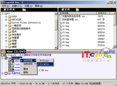 设置密码并刻录 添加好要加密的文件之后,我们就可以设置加密了。在图27下方我们可以看到已经添加了好多文件,那么是不是要对所有评论年都加密呢?这里我们可以根据需要进行选择,选择的方法是在前面的方框中打勾即可。选中之后我们就可以设置加密方式了,在要加密的文件或文件夹上右击,在弹出的菜单中选择“加密类型”,在这里有两种选择,即BitCrypt、Scramble。其中用BitCrypt方式加密的光盘只能在本机使用,这样即使别人知道密码也无法访问;而Scramble则完全受控于密码的限制了(如图28)。