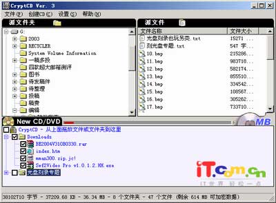 2.口令访问光盘 因为光盘是用于保存的,如果光盘不小心丢掉了,那么里面的数据岂不就是泄露了吗?没关系,我们可以给我们的光盘加一个访问口令,只有知道密码的用户才能进入,否则将无法进入。 添加文件 经过一翻搜索,笔者找到一款名为CryptCD的工具,利用该工具可以将文件制作成CryptCD所特有的映像文件,同时生成一个Setup.exe解密程序和Autorun.inf光盘自动运行文件,最后将生成的数据作为普通数据刻录进光盘即可。 运行CryptCD,它是一款绿色软件,软件主界面很简洁,上方是源文件夹和源文件区域,和Windows资源管理器窗口比较类似;下方是目标区域,被加密的文件和文件夹都将添加在这里。现在我们只需要将要刻录的文件从上方直接拖放到下方即可。随着文件的添加,我们可以在主界面中间查看已经使用的空间大小,或者在底部的状态栏里查看添加的文件信息(图27)。