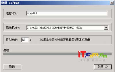 此时我们就可以将刻录盘放入刻录光驱中,单击“刻录CD/DVD”打开刻录界面(如图32),设置好卷标、刻录机等信息后,单击“刻录”按钮就可以了。