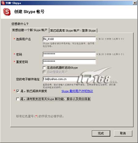 安装完毕后开始创建自己的Skype账户,注册很简单,填写“用户名”、“密码”就行了,电子邮件地址可填可不填。