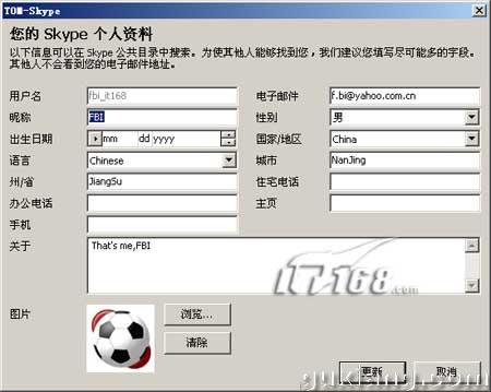 注册成功后,为了联系方便最好将自己的账户信息补充完整,包括“昵称”、“出生日期”、“国家/地区”、“城市”、“省”、“个人介绍”等等,图片栏可以设置一个自己个性图片(类似于MSN Messenger中的个人显示图片),设置完毕后单击“更新”。