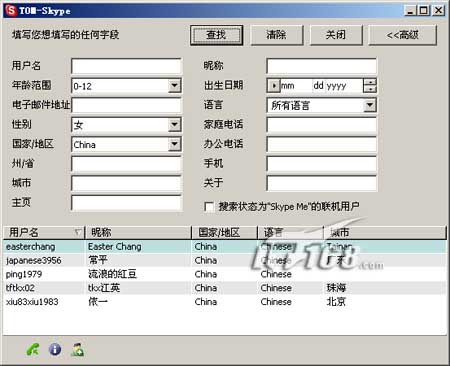 当然如果你朋友没有skype账户,那就随便找几个好友来玩玩吧,点击“高级”,输入查找条件,比如性别、国家、语言等。