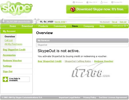 ·Oerview:整体介绍,如果没有购买点卡纪录则显示“SkypeOut is not active”; ·Call List:通话纪录,仅包括Skype到普通电话的通话; ·All My Purchases:所有商品,即你的购买纪录; ·Buy SkypeOut Credit:这里便是购买点卡的地方了,如果你有VISA卡就可以直接支付; ·Accessories:附加产品,这里是Skype推销耳机之类的东西,意义对我们不大; ·Redeem Voucher:这里是输入SkypeOut证号的地方,需要先购买了点卡才能设置; ·Settings:更改Skype密码和E-mail地址; ·Sign Out:退出登录。