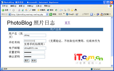 Blog这几年在网络上很红火,大家都把自己的一些心情故事和每天收集的资料写在上面,最近在网上发现了一个纯图片的Blog——PhotoBlog(照片日志),在这里可以把自己的一些照片或者网上收集的图片和网友进行共享,下面就让我们来一起看看吧。 注册 使用前先的注册一个用户名,点击首页上的“用户注册”进入注册界面,输入用户名、电子信箱和密码,手机号码随便输入几个数字就可以了(图1)。
