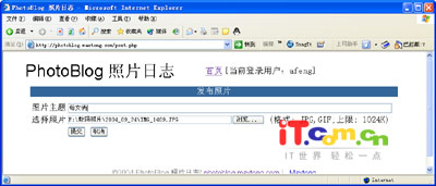 发布照片 接下来就可以点击首页上的“发布照片”来上传自己的照片,进入发布照片页面后先点击“浏览”按钮来选择一张照片,需要注意的是照片的格式只能是JPG和GIF的,而且照片的大小不能超过1024KB,接着就是输入照片的主题,完成后点击“提交”按钮就可以进行上传照片了(图3)。