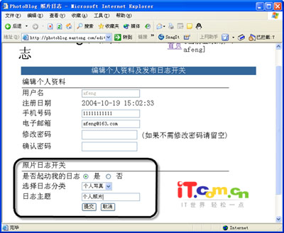 起动“我的日志” 注册好后可以点击首页的“用户登录”来进行登录,登录后我们还得启动自己的“照片日志”,点击左下角的“编辑个人资料及日志开关”,在显示的页面中把下面的“是”选中,然后在设置一下日志的分类和主题,设置好后就可以点击“提交”按钮了(图2)。