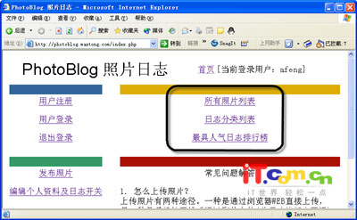 浏览PhotoBlog中的照片 发布完自己的照片后可以来欣赏了,在网站首页我们可以通过三种方式来进行查看,有查看所有照片,分类查看照片和按人气查看,大家可以根据自己需要来选择(图4)。