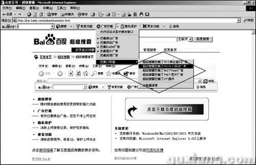 我们日常的工作、学习、生活习惯了依赖百度(www.baidu.com),如果在浏览所有网页时都能享受到百度的超级服务就好了。有办法,前不久百度发布了一款新产品——“百度超级搜霸”。这是一款免费的浏览器工具条,安装于IE浏览器的工具列表内,登录百度首页点开搜索工具,就能查看关于“超级搜霸”使用的详细介绍。 “百度超级搜霸”检索便捷,安装后无需登录百度网站,即可实现百度类型丰富的快速搜索,它支持站内查询,可以直接查询当前访问网站内的全部相关信息。另外还有多种强大功能,利用“百度超级搜霸”可以实现广告拦截、隐私保护、垃圾清理、系统加速、生活秘书、保存Flash等多种功能,我们访问任何网页时都可以享受“超级搜霸”带来的便利。 “百度超级搜霸”是百度悉心为网民打造的一款网络工具,安装后以工具条形式出现在浏览器上。3亿中文网页、80万经典MP3、海量网上图片、每天10万条新闻随时满足各类搜索请求。更有右键搜索功能,方便查询当前网页中任意文字,还提供中英文互译功能。 除了具备搜索功能,它还有“网络广告拦截”的功能(见图),我们可以通过设置选择管理各种网络广告;“隐私保护”、“垃圾清理”可使我们实现不同环境下的上网记录管理;它强大的“系统加速功能”也不失为我们优化电脑的好帮手。