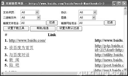 进行文件的批量下载,常常利用FlashGet中的“成批任务”进行下载,这需要在链接中使用通配符,以达到批量下载的目的。但如果链接地址规律性不好,则需要进行多次下载。使用Maxthon可以非常容易地进行文件的批量下载,而不用担心下载文件链接是否有无规律可循。 在Maxthon中打开有下载链接的页面,单击菜单“查看→页面链接列表”,打开“页面链接列表”窗口,其内会显示有当前页面的所有链接。首先单击“页面链接列表→设置下载工具”,在下拉工具列表中选择好您常用的下载工具(如FlashGet),单击“保存”,把FlashGet设置为“页面链接列表”中的默认下载工具并返回到如图所示的窗口。在每一个链接地址的后面都有一个复选框,想要下载哪个链接,就选中其后的复选框。如果该页面的链接太多,查找起来不方便,可在上面的“链接文本包含”或“链接网址包含”中输入指定的内容,单击其后的“过滤”按钮,即可快速筛选出所有包含指定内容的下载链接。最后单击“下载”按钮,即可自动调出FlashGet,并出现“添加新的下载任务”窗口来依次添加刚才选中的下载链接。