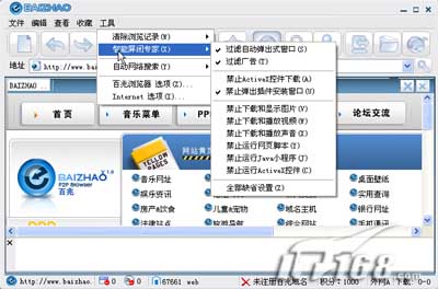 百兆浏览器除具备IE所有实用功能外,还有多页面浏览、广告猎手、自动清除上网痕迹、智能屏闭专家、自动快速网络搜索(在地址栏中直接输入内容即可执行搜索)、域名自动完成等用户最实用的功能。要实现自动过滤广告的功能,只需要进行如下的设置。