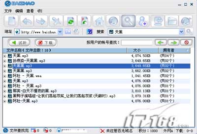 三、在线试听、下载音乐 该软件最大的一个特色就在于音乐试听、共享方面的强大功能,具体操作如下: 在主界面右上角有一个“搜索”窗口,选择“搜索mp3”,然后点击后面的搜索按钮即可打开MP3搜索界面,在搜索框中输入您要查找的关键字,如“天黑”,回车即开始搜索。在显示出来的结果集中双击一首歌曲即可开始试听。