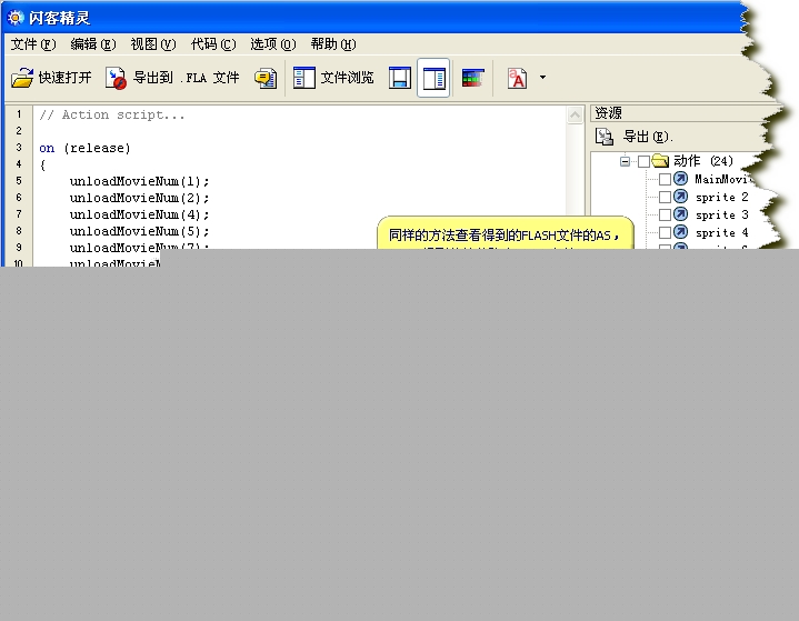 然后我们用闪客精灵打开刚刚下载的文件main.swf。分别点动作中的各个组建,查看其对应的AS。然后在AS中查找.SWF文件的相对路径和文件名。这里我们可以在MainMovie的AS中找到info.swf和shtmenu.swf两个文件也是和main.swf同一级目录的,所以得到其地址分别为: http://www.overflight.net/swf/info.swf http://www.overflight.net/swf/shtmenu.swf 我们用快车下载这两个文件,并也和main.swf存在同一级目录。