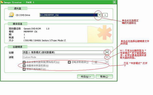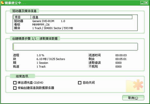 4.创建镜像文件。将所要镜像的光盘放入物理光驱,单击工具栏“创建”按钮或选择“文件”菜单下的“新建镜像”选项,弹出如下窗口:
