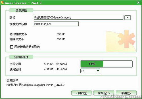 单击"向后",弹出图5。在"镜像属性"中可选择镜像文件的路径和名称,是否压缩镜像,在"驱动器属性"中可选择镜像文件所在的驱动器,PS:CDSPACE制作的镜像文件的扩展名为"*.LCD"