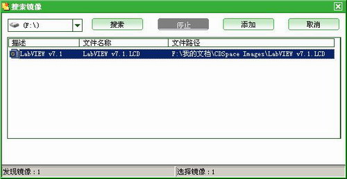 6.单击工具条上"搜索"按钮或"文件"菜单下的"搜索镜像"选项,可搜索已存在于硬盘上的CDSPACE镜像文件(*.LCD),搜索到所需的镜像文件后,可单击"添加"按钮将其加入列表内