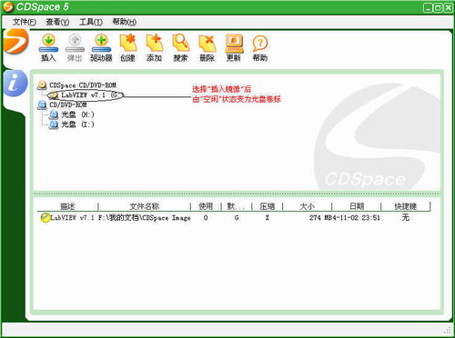 选择插入镜像,即将所选镜像文件载入CDSPACE虚拟光驱中(也可以用左键单击镜像文件,然后单击工具条上的"插入"按钮或选择"工具"菜单下的"插入镜像"选项)