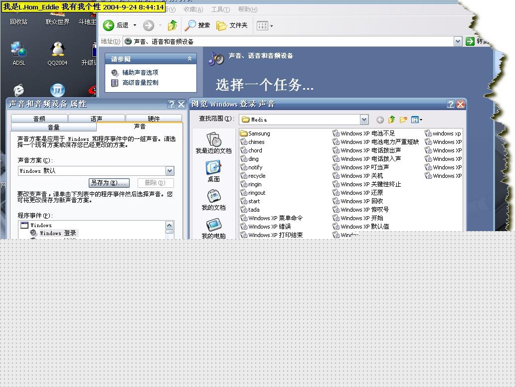 我也装了westoy朋友提供的 MAC+Samsung系列超酷系统声音 感觉不好~每开一个网页~删一个东西,甚至连刷新屏幕也会有声音,所以不喜欢就删了~ 删除方法: 在控制面板里选 声音设备 然后选 更改声音方案 在下拉菜单中选中Samsung声音,然后点右边的删除就可以了~~ 下面就是重点了~ 但是有很多朋友反映,删除Samsung方案后每开网页还是会带有Samsung方案中那个女人的凄凉声. 下面我教大家彻底的删除方法 如图,在打开声音方案后把声音方案设置回 WINDOWS默认,然后随便选一个程序时间中的声音, 我就选 WINDOWS登录, 然后在右下脚的"浏览" 会变成可选, 然后点浏览, 是不是看到了 声音方案的文件夹? 按我的图,是不是有一个Samsung的文件啊??? 把他删除 然后点取消就可以了~