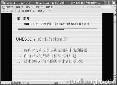 一般情况下,我们都是在全屏模式下播放PPT(Microsoft PowerPoint)文件,但很多场合下你可能需要让演示窗口与其他程序进行配合,这样看起来演示的效果更好,该如何激活窗口模式呢? 请注意,不要使用“幻灯片放映”菜单中的“观看放映”命令,也不要直接单击左侧工具栏中的“幻灯片放映”按钮,否则此时就只能使用Alt+Tab、Alt+Esc键切换到其他程序窗口了。我们应该先按住Alt键,然后再按下D、V两个键,这样就可以激活窗口播放模式了(如图所示),这时我们看到的就是一个包括标题栏、菜单栏的播放窗口,当然你可以任意更改该窗口的大小,也可以进行拖放,这就方便多了。