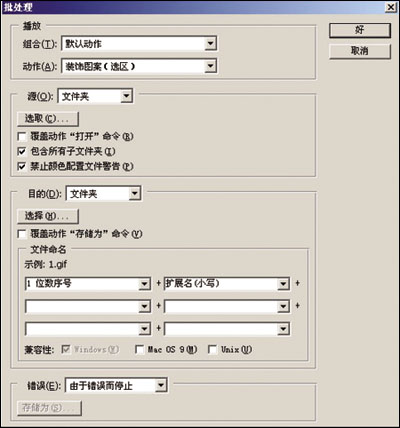 1. 在“动作”下拉菜单中选择“我的动作”。 2. 在“源”下拉菜单中选择“文件夹”。 3. 单击[选取]按钮在弹出的对话框中选择待处理的图片所在的文件夹,单击[确定]。单击选中“包含所有子文件夹”和“禁止颜色配置警告”这两个复选框。 4. 在“目的”下拉菜单中选择“文件夹”,单击[选择]按钮,在弹出的对话框中选择准备放置处理好的图片的文件夹,单击[确定]。 5. 在“文件命名”的第一个框的下拉菜单中选择“1位数序号”,在第二个框的下拉菜单中选择“扩展名(小写)”。 6.在“错误”下拉菜单中选择“将错误记录到文件”,单击[另存为]选择一个文件夹。批处理若中途出了问题,计算机会忠实地记录错误的细节,并以记事本存于选好的文件夹中。 这一切做好,检查无误之后,单击[好],计算机就会开始一张一张地打开处理和保存那些我们选中的图片,直到任务结束。我们则可以端杯咖啡,边品味边监视,或者到网上转转。