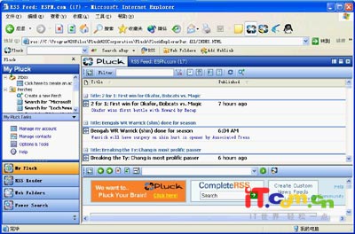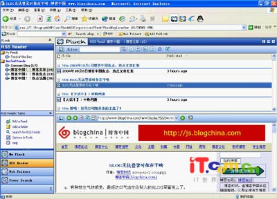 在上一篇文章中,我们讲了用RSS阅读器阅读blog文章,这样可以方便的查阅各个网站上的blog,而不用一个个网站依次浏览,现在我们再来介绍一下blog阅读的另类方法,通过安装相应的插件,可以在IE浏览器、电子邮件客户端方便的阅读blog。 一、用浏览器阅读blog 现在很多人上网浏览网页,主要用到的浏览工具依然是IE浏览器,习惯打开浏览器来查看来自各个网站的信息,只要给IE浏览器安装Blog阅读插件,可以在阅读blog的时候,不用打开过多的网站及浏览窗口的情况下,快速浏览来自各个网站的blog信息。 支持IE浏览器阅读blog的插件是Pluck,首先登录其官方网站:http://www.pluck.com,下载其安装文件,下载安装完成后,打开IE浏览器,就会看到其主界面了(如图1)