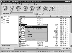 4.要是想把自己辛苦下载的语言补丁和进度存放在其中的话,还可以在WinISO中进入相应的文件夹,然后点击“Add”按键,并在弹出的窗口中选取补丁文件和游戏进度文件即可。这样制作出来的ISO应该说是为你量身定制的吧。 WinISO还能够把ISO镜像文件中的某些文件直接提取出来,这时只要双击某个ISO文件,WinISO会自动接手打开它,然后找到需要的文件并右击鼠标,然后在弹出的选单里选择“Extract”命令就能将它提取出来了(见图3)。此外,还可以直接对ISO镜像里的文件进行更名、删除和调用外挂杀毒软件查杀病毒。