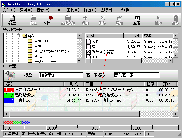 刚刻录的盘读很顺利。只用了131MB,好!我就再追加点数据试试看。重复“一,刻录数据光盘”的过程,选择好要新增加的数据并拖到下边去(此时会出现如下画面),