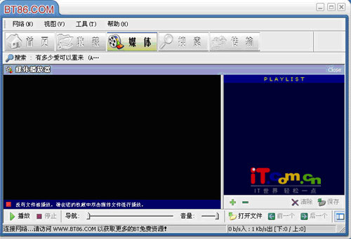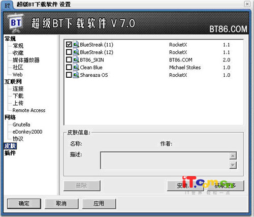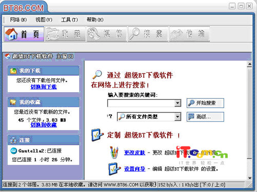 软件外观 Shareaza超级BT下载软件的操作界面在我见到BT下载软件中最为华丽,而且还是为数不多支持更换皮肤的BT客户端,程序内置有五种样式。“超级BT下载软件”的主界面(图1)不同于一般BT下载软件,在“窗口”菜单项中,用户可选择显示导航栏、遥控器及监视器等。在“视图”菜单项中,用户可即时切换普通模式、增强模式、收藏及安全等多种视图。在主窗口中按我的下载、我的收藏、连接以及连接进行分类,右侧的窗口可以使用软件的搜索功能,搜索相应的BT下载资源。