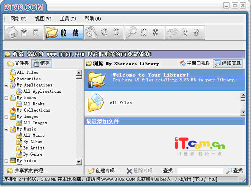 分类收藏管理 在下载文件的分类管理方面,超级BT下载软件体现出很高的用户自由度,可以按照需要自定义下载规划并定制其属性,但需要切换到“收藏”视图(图2)中分类目录中查看各种分类文件,也可以将下载文件分门别类进行存放和管理。