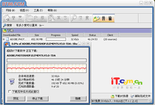 下载速度 下载测试文件:BT魔方“ADOBE.PHOTOSHOP.ELEMENTS.V3.0-TDA”种子(大小为652.90MB) 依据程序的默认设置,速率进入相对稳定状态后的结果如下(图3):