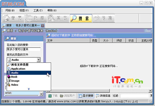总体传送速度:32KB/s 资源搜索 Shareaza超级BT下载软件切换到“资源搜索”视图(图4)后,利用内置的搜索引擎即可按需查找指定类型的文件。