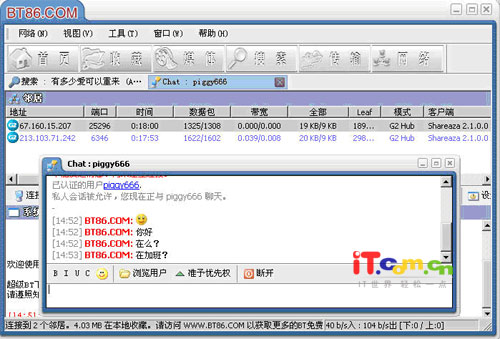 辅助功能 1、点对点聊天 Shareaza超级BT下载软件支持与指定用户进行点对点聊天,但前提是软件必须切换到“增强模式”下,点击“网络”按钮,选中显示的用户再单击鼠标右键“与用户聊天”菜单项,与用户建立聊天连接,从图5中可以看出聊天操作与MSN聊天操作一样。