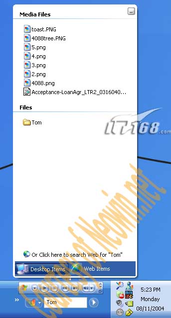 如果你不安装MSN Toolbar,你也就不能享受在资源管理器中进行桌面文件搜索了,这不能不说是一个遗憾,希望MSN开发小组能在未来解决这个问题。