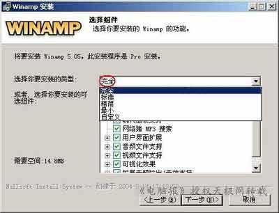 Winamp的安装很简单,只要一路点击就可以了。建议大家不妨将安装类型选为“完全”(图1),这样能使Winamp具备更为强大的功能。