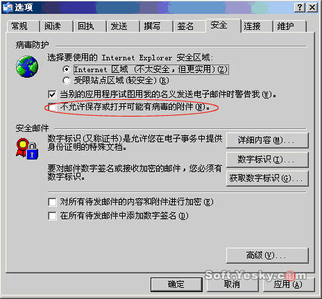 另外:有些朋友反映OE收信时打不开附件。可以按以下步骤来解决。在OE菜单里点击“工具--选项”。然后转到安全选项,在病毒防护下面的“不允许保存或打开可能有病毒的附件”(如图3)前的对勾去掉就可以把附件打开了。